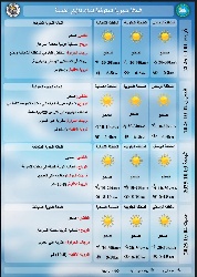 من جانبها، توقعت الهيئة العامة للأنواء الجوية والرصد الزلزالي التابعة لوزارة النقل، ارتفاعاً في درجات الحرارة.