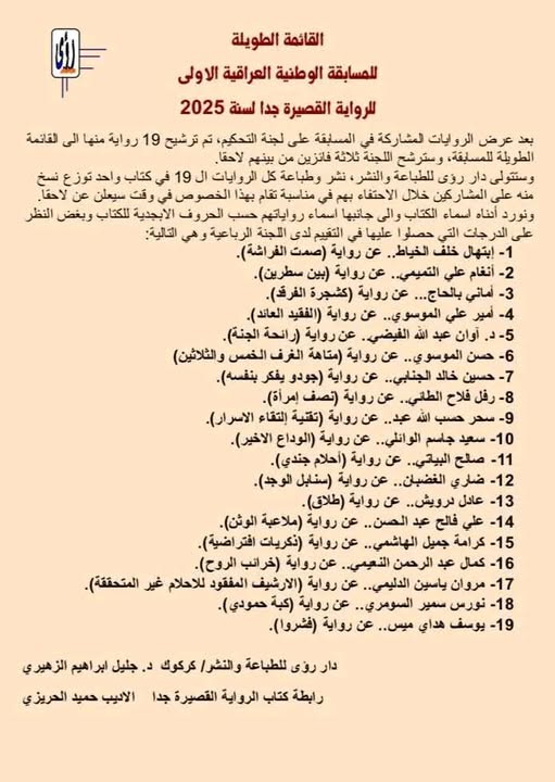 رشحت رابطة كتّاب الرواية القصيرة جداً، بالتعاون مع دار رؤى للطباعة والنشر في كركوك، 12 رواية قصيرة ضمن القائمة الخاصة بالدورة الأولى في المسابقة الوطنية العراقية للرواية القصيرة جداً 2025، حسب قرار لجنة التحكيم بعد فرز الأعمال المتقدمة.