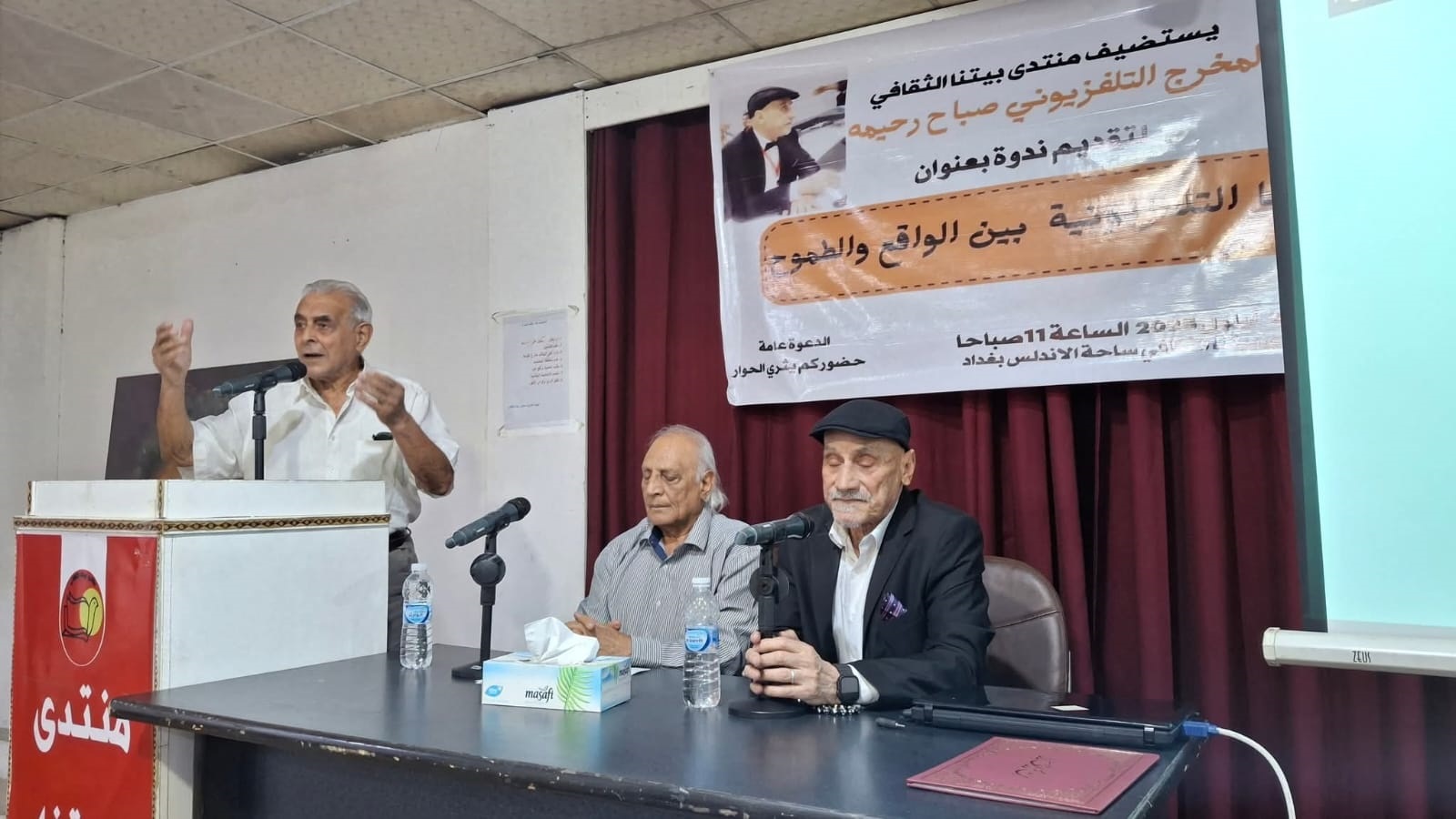 ضيف منتدى بيتنا الثقافي المخرج التلفزيوني صباح رحيمة في جلسة ثقافية بعنوان(الدراما التلفزيونية بين الواقع والطموح)، قدّمها الإكاديمي زهير البياتي، مرحبا بالحضور وضيف الجلسة قائلا(مرت الدراما التلفزيونية في فترات مختلفة، منها الجيدة التي لم تفرض وجودها في الواقع الفني والثقافي ففي السبعينات كانت الدراما العراقية متألقة عربيا. و في التسعينات ظهرت مسلسلات متميزة مثل عالم الست وهيبة. و بعد عام 2003 حدث تخبط في الدراما.لكن الدعم الاخير للدراما العراقية ساهم في انتعاش الدراما) .وأكد البياتي (الان تتصارع الدراما التلفزيونية بين تجسيد الواقع بصدق وتقديم رؤى طموحه..فمن ناحية تعكس الواقع الذي نعيشه بما فيه من قضايا وضغوط وحياة اجتماعية بتفاصيلها الدقيقة.ومن ناحية اخرى تقدم الدراما الطموحة وتساهم في تشكيل الوعي المجتمعي وتلهم الافراد نحو التغيير والتطلع نحو الأفضل وتعتبر وسيلة فعالة في ترسيخ الأفكار والقيم الموجودة في المجتمع ).