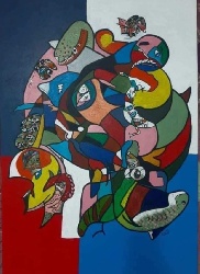 أهم ما يُميز لوحات الفنان هو الاشتباك الذي تبني عليه معمار اللوحة .وهذا الاشتباك يبدو سلمياً بالرغم احتوائه على عناصر متباينة وقد تكون متناقضة من حيث بنيتها .ينتج من هذه الظاهرة المنتَجة من البنية الفكرية علامات ينتمي بعضها إلى الأساطير كتشكيلة بنيوية خالصة ،تأخذ مفرداتها من البيئة لتحقيق حراكاً دائماً وحيوية تتخاطر مع ذاكرة المتلقي البصري بما يُساعد على تنشيط المخيلة المقابلة ،ونعني بها مخيلة المتلقي . وهي خاصية دالة على حيوية الاستعمال المرتكز على المخيال الفني .ولعل الاشتباك هذا لا يمسك بالصرامة بقدر ما يأتي على نوع من الخلخلة في البناء ،بمعنى يمنح المفردات حيوية الحركة والتخاطر مع المجاور من الرموز ومع البناء العام للوحة. إن حركة المفردات المتخيلة تمنح الاستقبال حرية التعامل والبناء على بناء أسسه الفنان ،بمعنى يُتيح فرصة انبثاق الحيوية من تصور حركة المفردات بما تضفيه على المجاور من علاقة مبنية على التكامل على السطح المتوفرة من طبيعة التعامل ،أي التداعي الحر لغرض التأسيس للمعنى الأعم والأكبر .وهي سمة واضحة على لوحاته التي توحي بالتشابك وحيوية البناء .