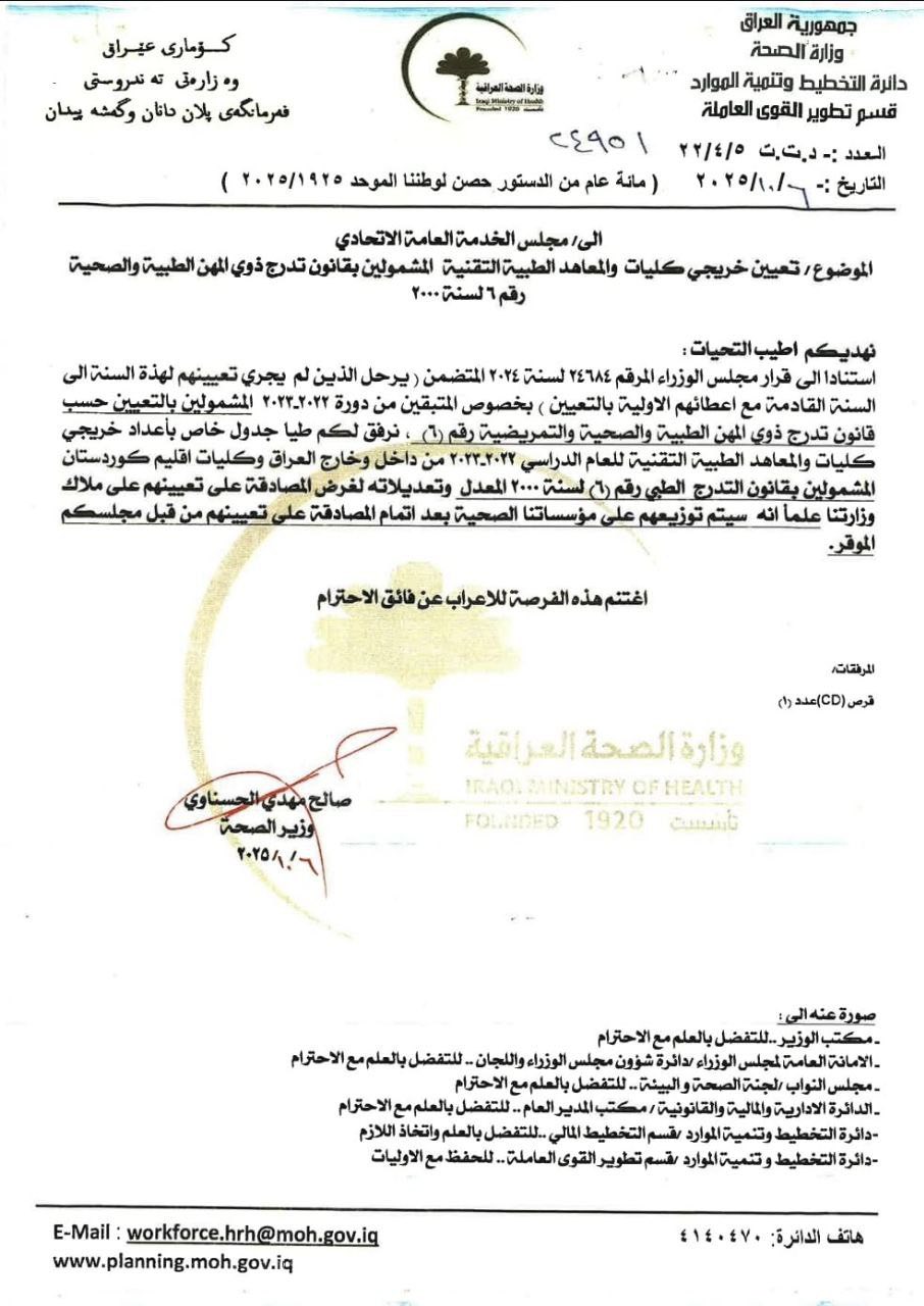 ارسلت وزارة الصحة، جداول تعيينات خريجي ذوي المهن الصحية إلى وزارتي المالية ومجلس الخدمة العامة، للعام الدراسي 2022-2023. وقال بيان بيان تلقته (الزمان) أمس إن (الخطوة تأتي استناداً إلى قرار مجلس الوزراء الذي يقضي بترحيل غير المعينين خلال هذا العام إلى العام المقبل مع منحهم الأولوية في التعيين)، مشيراً إلى إن (الجداول تتضمن أعداد خريجي كليات المجموعة الطبية داخل وخارج العراق، إضافة إلى خريجي كليات التمريض والمعاهد الطبية التقنية للعام الدراسي ذاته، تمهيداً لإدراجهم ضمن العناوين الوظيفية وتخصيص المبالغ المالية اللازمة لتعيينهم). وكانت الوزارة قد أعلنت بدء حملة تلقيح المواطنين بلقاح الإنفلونزا الموسمية في جميع مراكز الرعاية الصحية الأولية وعدد من المستشفيات في بغداد والمحافظات. واكد بيان تلقته (الزمان) أمس أن (دوائر الصحة في جميع المحافظات باشرت فعليًا تنفيذ البرنامج الوقائي الخاص بتلقي اللقاح عبر المراكز الصحية والمستشفيات الحكومية)، وأضاف إن (اللقاح متوفر مجانًا لجميع المواطنين، لا سيما الفئات الأكثر عرضة للإصابة)، وأوضح الوزارة إن (الحملة تأتي ضمن جهودها الوقائية المستمرة لحماية المواطنين من الأمراض التنفسية والحد من معدلات الإصابة والمضاعفات الناتجة عن فيروس الإنفلونزا)، وشدد على (أهمية أخذ اللقاح لتقليل احتمالية الإصابة وشدة الأعراض والمضاعفات)، مؤكدة إن (اللقاح آمن ومعتمد من منظمة الصحة العالمية)، داعياً إلى (التوجه إلى أقرب مركز صحي لتلقي اللقاح، مع الالتزام بالإجراءات الوقائية مثل غسل اليدين بانتظام وتجنب التجمعات والمحافظة على التغذية الصحية).