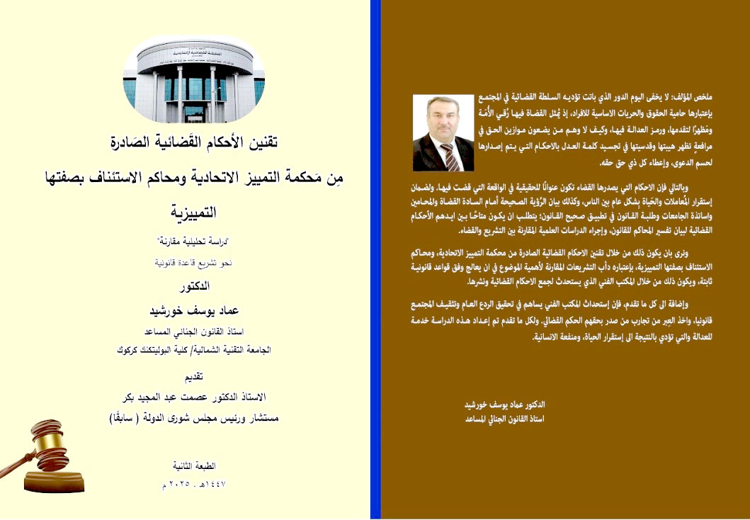 ( تقنين الأحكام القَضائية الصَادرة مِن مَحكمة التمييز الاتحادية ومحاكم الاستئناف بصفتها التمييزية - دراسة تحليلية مقارنة) نحو تشريع قاعدة قانونية. للأستاذ المساعد الدكتور عماد يوسف خورشيد/ كلية البوليتكنك كركوك/ الجامعة التقنية الشمالية. وتلخص الكتاب في الاتي بيانه: