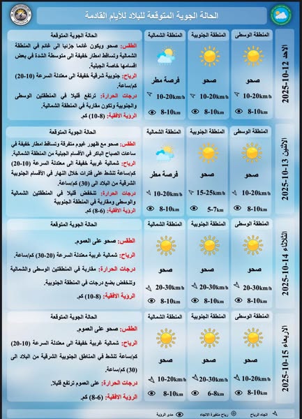 رجحت الهيئة العامة للأنواء الجوية والرصد الزلزالي التابعة لوزارة النقل، إن يكون طقس اليوم الاحد صحواً يتحول الى غائم مصحوب بامطار شمالاً. وقال بيان تلقته (الزمان) أمس إن (طقس اليوم الأحد سيكون صحواً يتحول تدريجياً إلى غائماً جزئياً مصحوبا بتساقط أمطار خفيفة إلى متوسطة الشدة شمالاً)، مشيراً إلى إن (درجات الحرارة العظمى تسجل في دهوك 26 والسليمانية 27 وأربيل ونينوى 29 وكركوك والأنبار 32 وصلاح الدين وديالى 33 وبغداد وكربلاء وبابل وواسط 35 والنجف والديوانية 36 وميسان وذي قار والمثنى والبصرة 37 درجة مئوية).