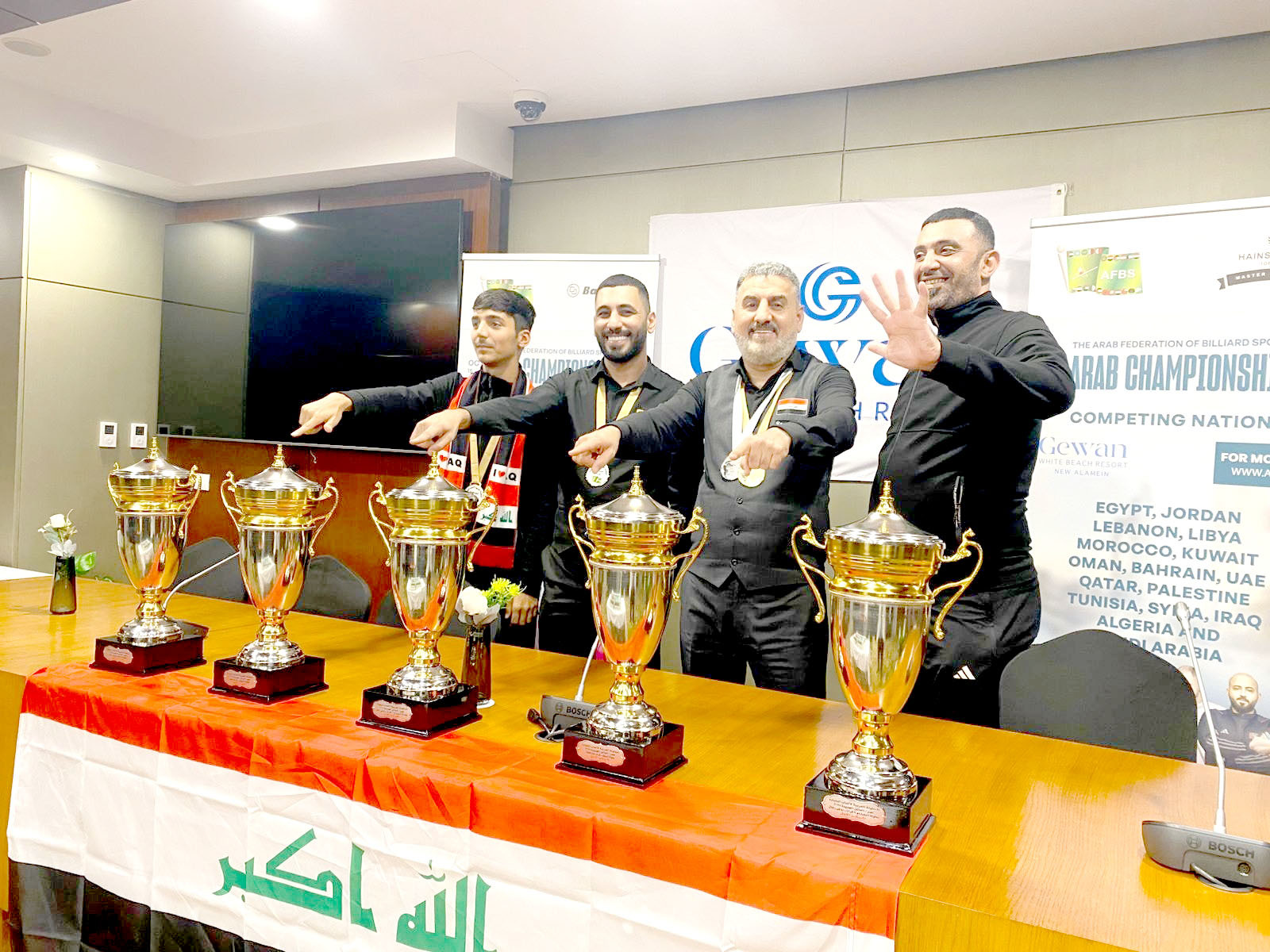 حقق المنتخب العراقي للبليارد والسنوكر إنجازاً عربياً جديداً بعد فوزه بالمركز الأول وحصوله على ثمانية اوسمة بواقع خمسة ذهب وواحد فضة وبرونزيين في البطولة العربية التي اقيمت في مدينة العلمين بمحافظة الإسكندرية جمهورية مصر ، بمشاركة أكثر من 15 دولة عربية. وجاء تتويج العراق بعد سلسلة من الانتصارات المميزة التي قدمها لاعبوه في منافسات البليارد والسنوكر الفردية والزوجية، حيث تألق اللاعبون فراس كامل ، وعلي جليل ، ومحمد قصي بأداء عال مكنهم من تحقيق الاوسمة الملونة متفوقين بمجموع الذهب ليعلنوا خطف المركز الاول بجدارة و ثمن رئيس الاتحاد العراقي للبليارد والسنوكر شمس الدين عبدالعال الدعم الكبير الذي يقدمه رئيس اللجنة الأولمبية الوطنية العراقية مؤكداً ان هذا الانجاز جاء بعد جهود متواصلة وتعاون مشترك بين اللجنة الأولمبية واتحاد البليارد والسنوكر لتذليل جميع الصعاب التي تواجه اللاعبين كما اشاد السيد عبدالعال بالمستوى المتميز الذي قدمه الفريق العراقي، مؤكداً أن هذا الإنجاز يعكس التطور الكبير الذي ينعكس على اللاعبين في جميع البطولات خلال السنوات الأخيرة.