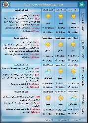توقعت الهيئة العامة للأنواء الجوية والرصد الزلزالي التابعة لوزارة النقل، تسجيل 5 محافظات درجات حرارة دون الـ30 مئوية. وقال بيان تلقته (الزمان) أمس إن (طقس اليوم السبت سيكون صحواً، ويكون غائماً جزئياً خلال الليل شمالاً)، وأضاف إن (درجات الحرارة العظمى تسجل في دهوك 27 والسليمانية وأربيل 28 ونينوى والأنبار 29 وكركوك 30 وبغداد وصلاح الدين وديالى وكربلاء 31 والنجف وواسط والمثنى والديوانية 32 وبابل وميسان وذي قار والبصرة 33 درجة مئوية)، مؤكداً إن (طقس يوم غد الأحد سيكون صحواً مع ظهور بعض الغيوم العالية في أماكن متفرقة من البلاد، ودرجات الحرارة مقاربة لليوم السابق)، ولفت إلى إن (طقس يوم الاثنين المقبل سيكون صحواً مع ظهور بعض الغيوم في المنطقة الشمالية، ودرجات الحرارة مقاربة على العموم).
