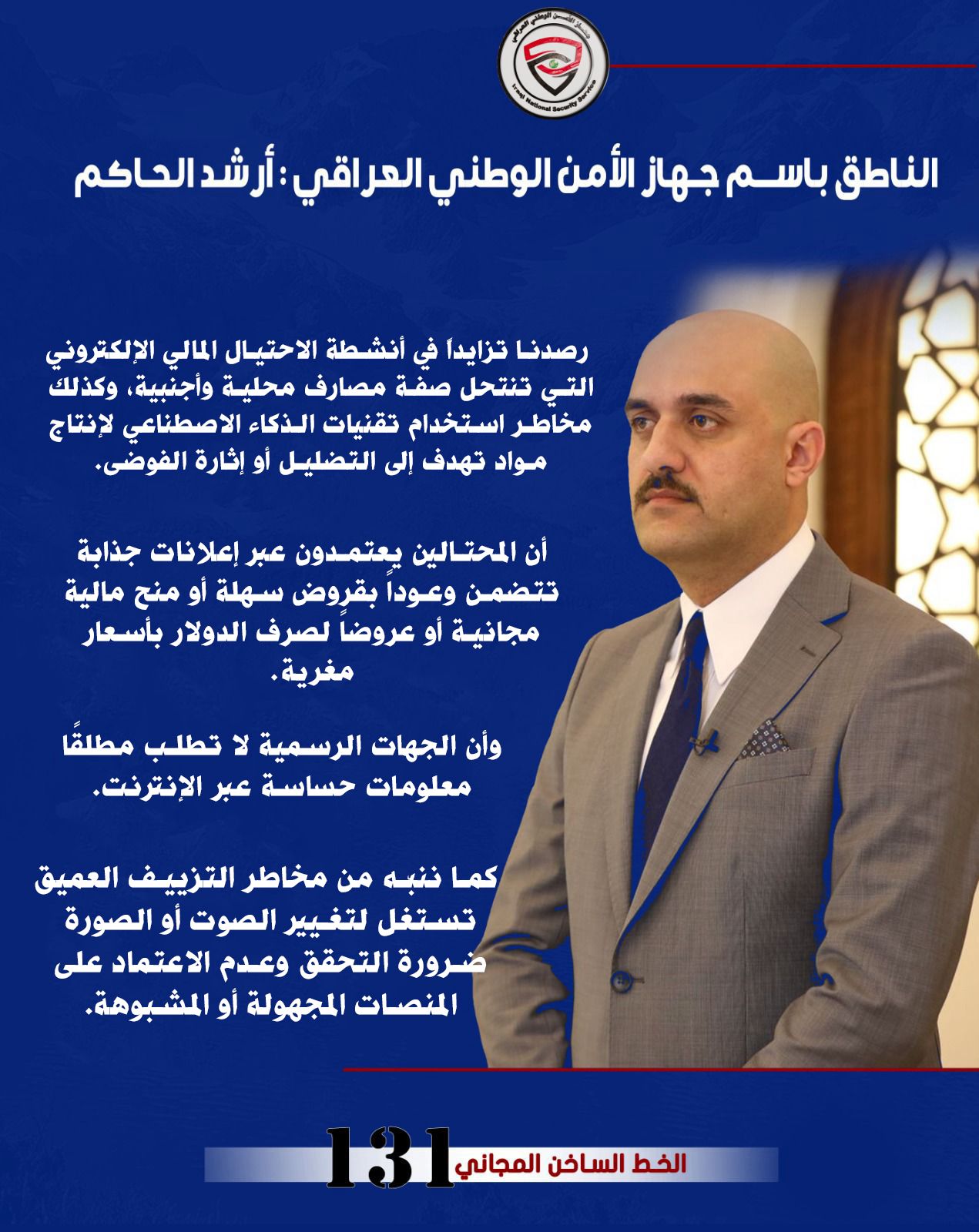 تصاعدت أنشطة الاحتيال المالي الإلكتروني والتزييف العميق التي تنفذ عبر مواقع وصفحات تنتحل صفة مصارف محلية وأجنبية بغرض سرقة أموال المواطنين وبياناتهم المصرفية، فيما حذر جهاز الامن الوطني المواطنين من مشاركة بياناتهم الشخصية. وقال الناطق باسم الجهاز أرشد الحاكم في بيان تلقته (الزمان) أمس إن (عمليات النصب تُدار عبر إعلانات جذابة تتضمن وعوداً بمنح مالية أو قروض ميسرة أو بيع الدولار بأسعار مغرية، قبل أن يُوجَّه الضحايا إلى مواقع مزيفة تطلب بياناتهم المصرفية ليتم الاستيلاء على رواتبهم أو إجراء تحويلات دون علمهم)، داعياً المواطنين إلى (التحقق من أي جهة مالية عبر قنواتها الرسمية والتواصل المباشر مع المصارف قبل الإدلاء بأي معلومات شخصية أو مصرفية)، مؤكداً إن (الجهات الرسمية لا تطلب مطلقاً بيانات حساسة عبر الإنترنت)، وتابع إن (خطر التزييف العميق باستخدام تقنيات الذكاء الاصطناعي، بات يتسع لتغيير الصوت والصورة وإنتاج مواد مضللة تُستغل لإثارة الفوضى والتشويش على الرأي العام)، مشدداً على (أهمية التحقق من المحتوى قبل تداوله وعدم الوثوق بالمنصات المجهولة أو المشبوهة). فيما  نفى جهاز مكافحة الإرهاب في إقليم كردستان، ما تداولته مواقع التواصل عن وقوع هجوم بطائرة مسيّرة على قضاء بيرمام. وقال الجهاز في بيان تلقته (الزمان) أمس (انتشرت عبر بعض القنوات الإعلامية ومنصات التواصل الاجتماعي، معلومات غير صحيحة، زُعم فيها وقوع هجوم بواسطة طائرة مسيّرة وسماع صوت انفجار في قضاء بيرمام)، وأضاف إن (الأصوات التي سُمعت كانت نتيجة تدريبات ومناورات عسكرية ولا يوجد أي خطر أو تهديد أمني).