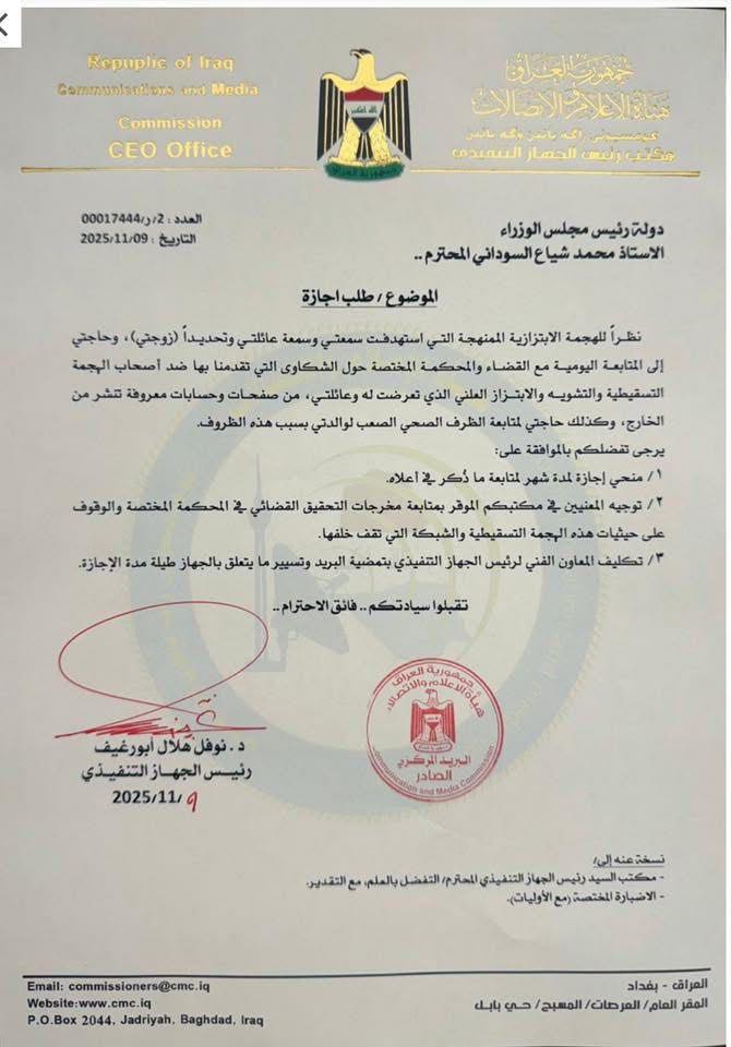قدم رئيس الجهاز التنفيذي في هيئة الإعلام والاتصالات نوفل أبو رغيف، طلب إجازة لمدة شهر إلى رئيس الوزراء محمد شياع السوداني، عازياً ذلك إلى تعرضه لهجمة تسقيطية ممنهجة استهدفت سمعته وسمعة عائلته. وأوضح أبو رغيف في نص الطلب الذي اطلعت عليه (الزمان) أمس إن (الإجازة تأتي لمتابعة القضايا القانونية ضد الجهات التي تقف خلف حملة التشويه والابتزاز العلني عبر صفحات وحسابات خارجية، فضلاً عن متابعة الحالة الصحية لوالدته)، مطالباً (بتكليف معاون الجهاز التنفيذي بتسيير أعمال الجهاز طيلة مدة الإجازة، ومتابعة مخرجات التحقيق القضائي للشبكة التي تقف وراء الهجمة التسقيطية).