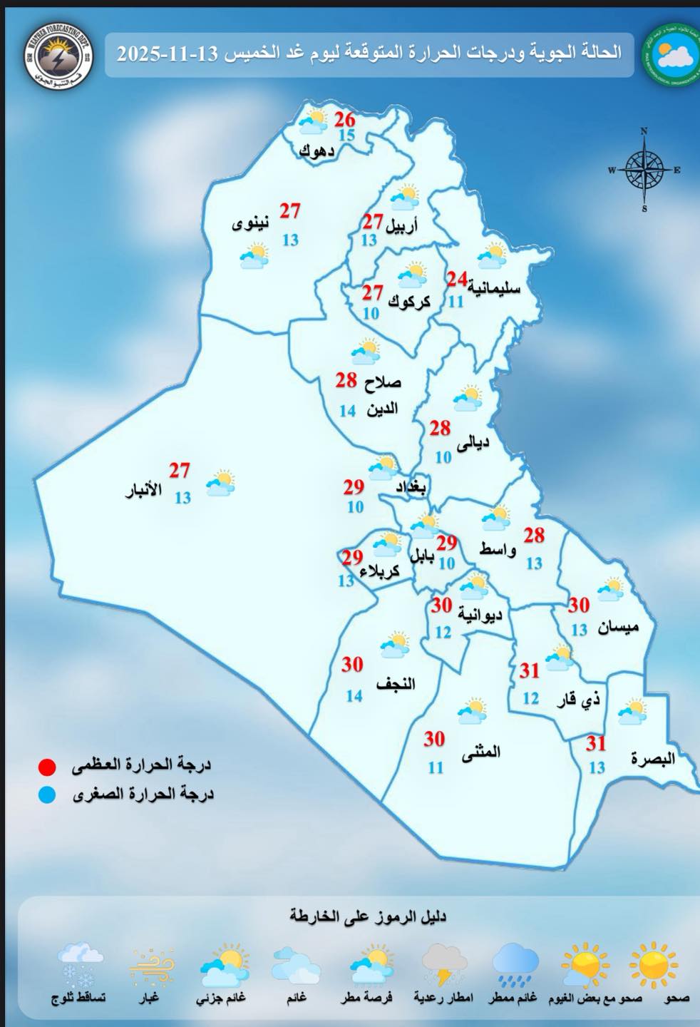 رجحت الهيئة العامة للأنواء الجوية والرصد الزلزالي التابعة لوزارة النقل، تساقطاً للأمطار وعواصف رعدية بدءاً من يوم غد الجمعة. وقال بيان تلقته (الزمان) أمس إن (طقس اليوم الخميس سيكون غائماً جزئياً وأحياناً غائماً، ودرجات الحرارة تسجل في بغداد وكربلاء وبابل 29 وديالى وصلاح الدين وواسط 28 وميسان والنجف والديوانية والمثنى30 ودهوك 26 والسليمانية 24 وأربيل ونينوى وكركوك والأنبار27 والبصرة وذي قار 31 درجة مئوية)، وتابع إن (طقس يوم غد الجمعة سيكون غائماً جزئياً ويتحول الى غائم بعد الظهر مع تساقط أمطار خفيفة إلى متوسطة الشدة في أماكن متعددة من البلاد وابتداءً من الأقسام الغربية ليلاً، وفرصة لحدوث عواصف رعدية أحيانا، اما الرياح، فتنشط على فترات في الأقسام الغربية، مسببة آثار غبار في بعض الأماكن)، وتابع البيان إن (طقس يوم السبت سيكون غائماً وممطراً في أغلب مدن البلاد، ولاسيما الشرقية منها، مع حدوث عواصف رعدية أحيانا ويبدأ بالتحسن ليلاً ابتداء من الأقسام الغربية من البلاد). وتبلغ زخة شهب الثوريات الشمالية، ذروتها فجر اليوم الخميس، حيث يمكن لمحبي رصد السماء في الوطن العربي محاولة مشاهدتها في أجواء صافية ومظلمة بعيداً عن التلوث الضوئي. ورجح ماجد أبو زاهرة في بيان أمس (بدء نشاط الزخة أمس، حيث كان موضع الإشعاع، أي النقطة التي تنطلق منها الشهب ظاهرياً على ارتفاع نحو 85 درجة فوق الأفق الشرقي في كوكبة الثور)، وأضاف إن (هذه الزخة من الزخات الهادئة نسبياً إذ لا يتجاوز معدلها الوسطي 5 شهب في الساعة).