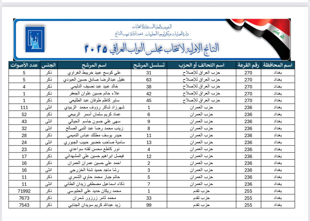 نتائج بغداد الأولية تظهر الأعلى أصواتاً بين المرشحين