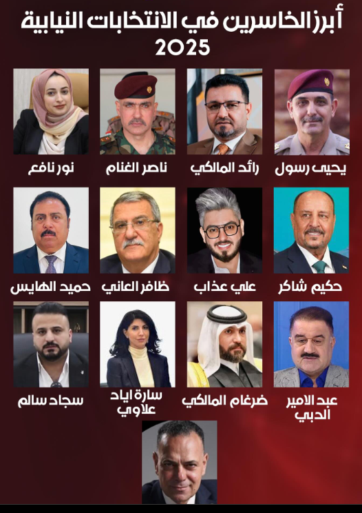 أفرزت نتائج الانتخابات البرلمانية، مفاجآت ثقيلة أطاحت بعدد من الأسماء البارزة، لتكشف عن خسائر غير متوقعة لرموز سياسية ومرشحين معروفين. وبحسب النتائج المعلنة اول امس فإن (رئيس تحالف العمق الوطني خالد الأسدي لم يحصد سوى ألف صوت في بغداد، بينما خرج الجنرال نوري غافل الدليمي من السباق بعد حصوله على 1300 صوت فقط، وسجل مستشار رئيس الوزراء إبراهيم الصميدعي، واحدة من أضعف النتائج بـ55 صوتاً، في حين خسرت النائبة السابقة عائشة غزال المساري، مقعدها).