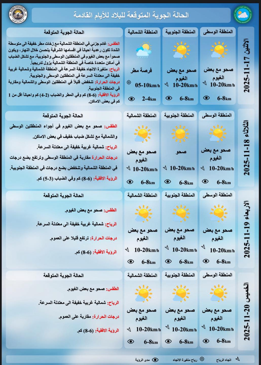 الأنواء: إنخفاض الحرارة وأمطار شمالاً