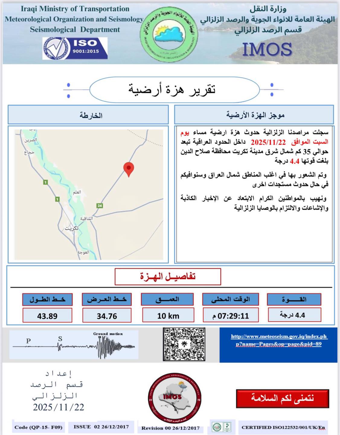 توقعت الهيئة العامة للأنواء الجوية والرصد الزلزالي التابعة لوزارة النقل، إن يكون طقس اليوم الاثنين صحوا مع بعض الغيوم. وقالت الهيئة في بيان أمس إن (طقس اليوم الاثنين سيكون صحواً مع بعض الغيوم في الأجزاء الغربية من البلاد، ودرجات الحرارة تسجل في دهوك 22 ونينوى 23 والسليمانية وصلاح الدين وأربيل والأنبار 24 وديالى وكركوك 25 وبغداد وكربلاء والنجف وبابل 26 وواسط والديوانية 27 وذي قار والمثنى 28 وميسان والبصرة 29 درجة مئوية)، مشيراً إلى إن (طقس يوم غد الثلاثاء سيكون غائماً على العموم، مع فرصة لتساقط زخات مطر خفيفة الشدة في الأجزاء الغربية من المنطقة الوسطى)، وتابع إن (طقس يوم الأربعاء المقبل سيكون صحواً في المنطقة الوسطى وغائماً جزئياً في المنطقتين الشمالية والجنوبية، مع فرصة لتساقط زخات مطر شمالاً). وسجلت المراصد الزلزالية، هزة أرضية بقوة 4,4 درجات قرب محافظة صلاح الدين. وأوضحت المراصد الزلزالية في بيان تلقته (الزمان) أمس إنها (قوة الهزّة بلغت 4.4 درجات وتبعد 35 شمال شرق تكريت).