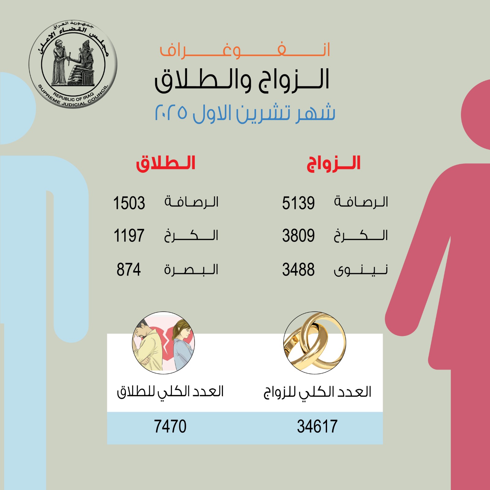 سجل مجلس القضاء الأعلى، نحو 7470 حالة طلاق خلال شهر تشرين الأول الماضي. واطلعت (الزمان) على إحصائية للقضاء أمس جاء فيها إن (عدد حالات الزواج المسجلة بلغ 34 الف و 617حالة، بينما وصلت حالات الطلاق إلى 7470 حالة، أي بمعدل يقترب من 250 حالة طلاق يومياً)، وأشارت الاحصائية إلى إن (محكمة استئناف الرصافة سجلت اعلى حالة طلاق بواقع 1503 والزواج 5139).
