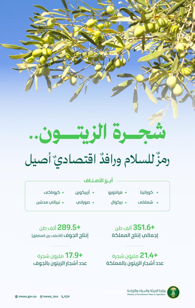 كشفت وزارة البيئة والمياه والزراعة السعودية ، عن ارتفاع كميات الإنتاج المحلي للزيتون في المملكة، إلى أكثر من 351 ألف طن، وازدياد مساحات زراعته في مختلف مناطق الميز النسبية الإنتاجية؛ حيث قارب إجمالي عدد أشجار الزيتون الـ 21.5 مليون شجرة، موزعة على عددٍ من المناطق، من بينها ما يزيد عن 18 مليون شجرة مثمرة، مبينةً أن الزيتون يُعد أحد المحاصيل الزراعية الواعدة، التي تلعب دورًا محوريًا في دعم التنمية الاقتصادية والاجتماعية المستدامة، وتعزيز الأمن الغذائي، تحقيقًا لأهداف الإستراتيجية الوطنية للزراعة، ومستهدفات رؤية السعودية 2030.