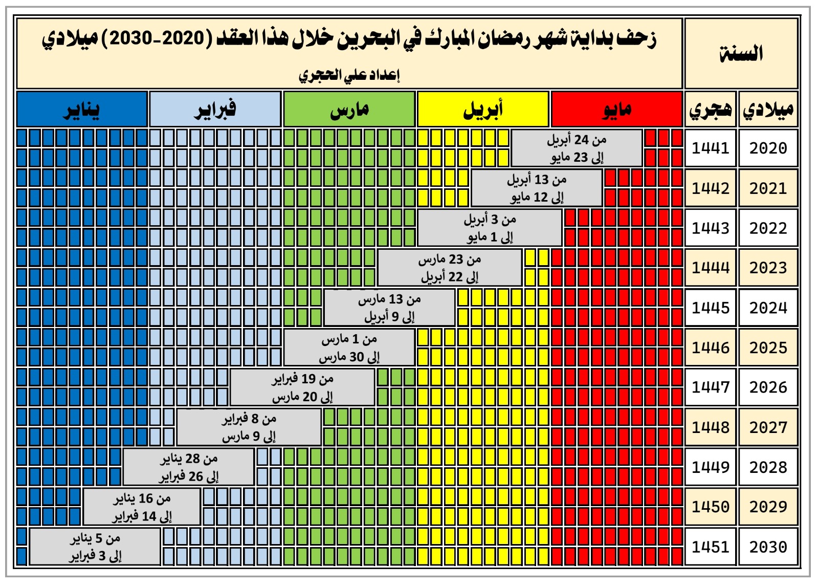 واختتم الحجري حديثه موضحاً ما يميز انحسار أنفاس أخر أيام فصل الخريف وبزوغ أول أيام فصل الشتاء بعد أقل من شهر من الآن، بإطلالة تأخر رفع أذان الصبح وتقدم رفع أذان المغرب على أفق البحرين، لتغدو ساعات الصيام أقصر ما يكون طوال العام، وكأنها هدية من رب العالمين للمؤمنين، وهي تمتد على مدى 42 يوماً، وذلك ابتدأ من يوم الأحد القادم 30 تشرين الثاني الجاري حتى 10 كانون الثاني 2026، وهي فرصة سانحة لكل من أراد أن ينهل من بركة الصيام سواءً استحباباً أو قضاءً، فيما أكد الحجري أن شهر رمضان المبارك سيأتي في الأعوام ما بين 2030 و2035 محملاً بأقصر أيام صيامه.
