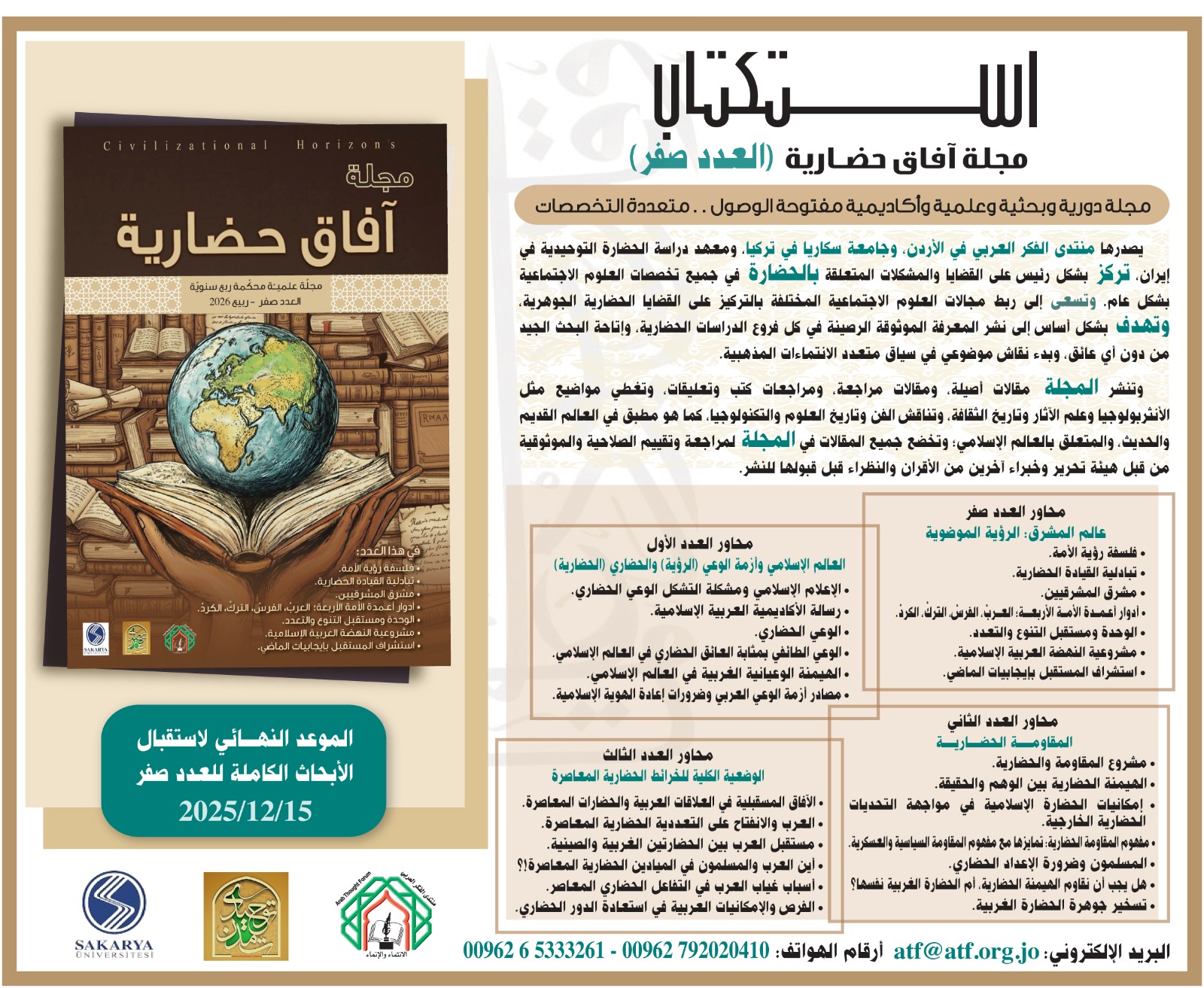 اعلنت مجلة آفاق حضارية الصادرة عن منتدى الفكر العربي وجامعة سكاريا في تركيا، ومعهد دراسة الحضارة التوحيدية في إيران، عن بدء استقبال مساهمات بحثية للمشاركة في العدد صفر: عالم المشرق: الرؤية الموضوعيّة.
