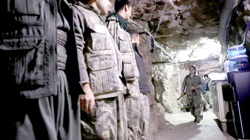 وعلى طريق جبلي ضيق ومتعرج، يترجّل مقاتل من الحزب عن شاحنته الصغيرة قرب نهاية الطريق، قبل أن يرفع هاتفاً معلقاً على جذع شجرة لإبلاغ رفاقه بقدومه. ومن هناك، يهبط مع مجموعة من المقاتلين نحو مخبأ محفور داخل صخور الجبل، يمثل أحد مواقع الحزب التي تحولت منذ عقود إلى قواعد خلفية لهم في شمال العراق.