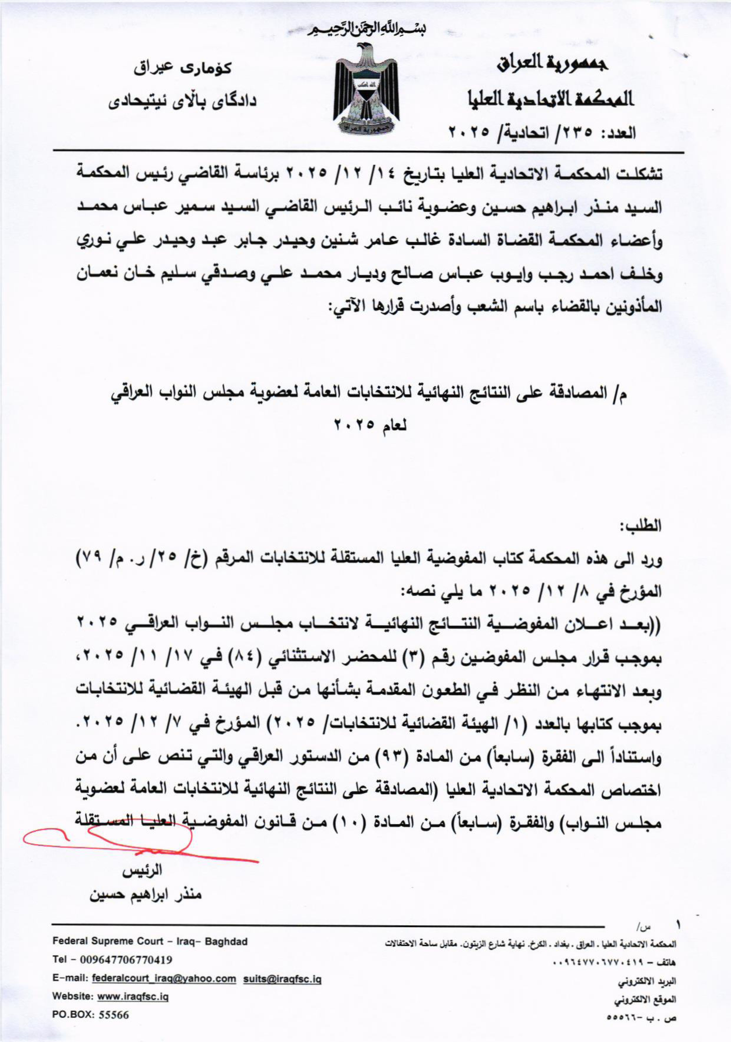 وقال بيان تلقته )الزمان) أمس إن (المحكمة الاتحادية العليا، وبحضور رئيسها منذر إبراهيم حسين وكامل أعضائها، عقدت جلسة خاصة لتدقيق النتائج النهائية للانتخابات العامة لعضوية مجلس النواب للدورة السادسة، الواردة من المفوضية العليا المستقلة للانتخابات)، وأضاف إن (المحكمة وبعد التدقيق والمداولة، تبين لها أن عملية الاقتراع العام لانتخابات أعضاء مجلس النواب قد استوفت جميع المتطلبات الدستورية والقانونية، ولم يثبت وجود ما يخل بصحتها)، مشيراً إلى أنه (وبالاستناد إلى أحكام الفقرة سابعاً من المادة 93 من دستور جمهورية العراق لسنة 2005، قررت المحكمة المصادقة على النتائج النهائية للانتخابات للفائزين، الواردة أسماؤهم في القوائم المرسلة من المفوضية). وتابع البيان إن (المحكمة قررت أيضاً إشعار السلطات التشريعية والتنفيذية والقضائية بقرار المصادقة على النتائج النهائية للانتخابات)، مؤكداً أن (القرار باتاً وملزماً للسلطات كافة، استناداً إلى أحكام المادتين 93 سابعاً و94 من الدستور، والمادتين 4 سابعاً و5 ثانياً من قانون المحكمة الاتحادية العليا المعدل). وتوقّع خبراء في الشأن السياسي، إن تشهد الأيام المقبلة، حراكًا مكثفًا ومفاوضات بين القوى الفائزة، بهدف تمرير استحقاق الرئاسات دفعة واحدة لتجنب الانسداد، مؤكدين إن عامل الوقت والضغوط الشعبية قد يدفعان الأطراف إلى تقديم تنازلات متبادلة لضمان تشكيل سلطة مستقرة. وأشار خبراء أمس إلى إن (نجاح خيار السلة الواحدة يبقى مرهونًا بقدرة الكتل الكبرى على تجاوز الخلافات العميقة وتغليب منطق الشراكة السياسية)، محذرين من إن (فشل التوافق قد يعيد البلاد إلى دوامة التعطيل ويؤثر على ثقة الشارع بالعملية).