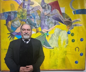 في لوحة «انتفاضة الشباب» يشتغل الفنان على التوتر الحاد بين انفجار اللون وحركة الجسد، حيث يتحوّل الجيل الجديد إلى موجة صاعدة تشبه أسراب السمك حين تخرج عن مسارها لتكسر التيار. الأجساد هنا لا تُرسم بتفاصيل تشخيصية مكتملة، بل بتكوينات تعبيرية تجريدية توحي أكثر مما تصف، كأنّ الشباب طاقة قبل أن يكونوا أفرادًا، وصوت قبل أن يكونوا ملامح. هذا الامتداد التعبيري يبلغ ذروته في «ملحمة الشهيد»، لوحة تُقدّم الشهيد كرمز إنساني عام لا ينتمي لزمان أو مكان محدّد، جسدًا يتسامى عن جراحه ليضيء محيطه بدل أن يغرق في دمه. السمك والحمام يطلّان في الخلفية ككائنات تراقب المشهد، وكأنها تشهد على دورة الفقد والتضحية التي لا تتوقف، لكن حضورها المتكرّر يوحي أيضًا بأن دم الشهيد يتحوّل إلى حياة جديدة في عروق الجماعة. وتبدو «الانتفاضة الفلسطينية» امتدادًا طبيعيًا لهواجس الفنان حول الحرية والاحتلال والكرامة، حيث تُستدعى فلسطين عبر إيقاع لوني حاد وحركة كتلية تشبه تكسّر الأمواج على صخور عنيدة لا تنكسر. يتداخل الرمزي بالتاريخي حين يظهر صلاح الدين، لا كشخصية أسطورية جامدة، بل كمحور بصري تتقاطع عنده الذاكرة الدينية والقومية مع أسئلة الراهن؛ وجه ربما لا يُرسم بالكامل، إنما تُلمح ملامحه وسط دوامات الخطوط والألوان، في إشارة إلى أن الرموز التاريخية لا تزال حاضرة بوصفها ضميرًا أخلاقيًا أكثر منها تماثيل حجرية.