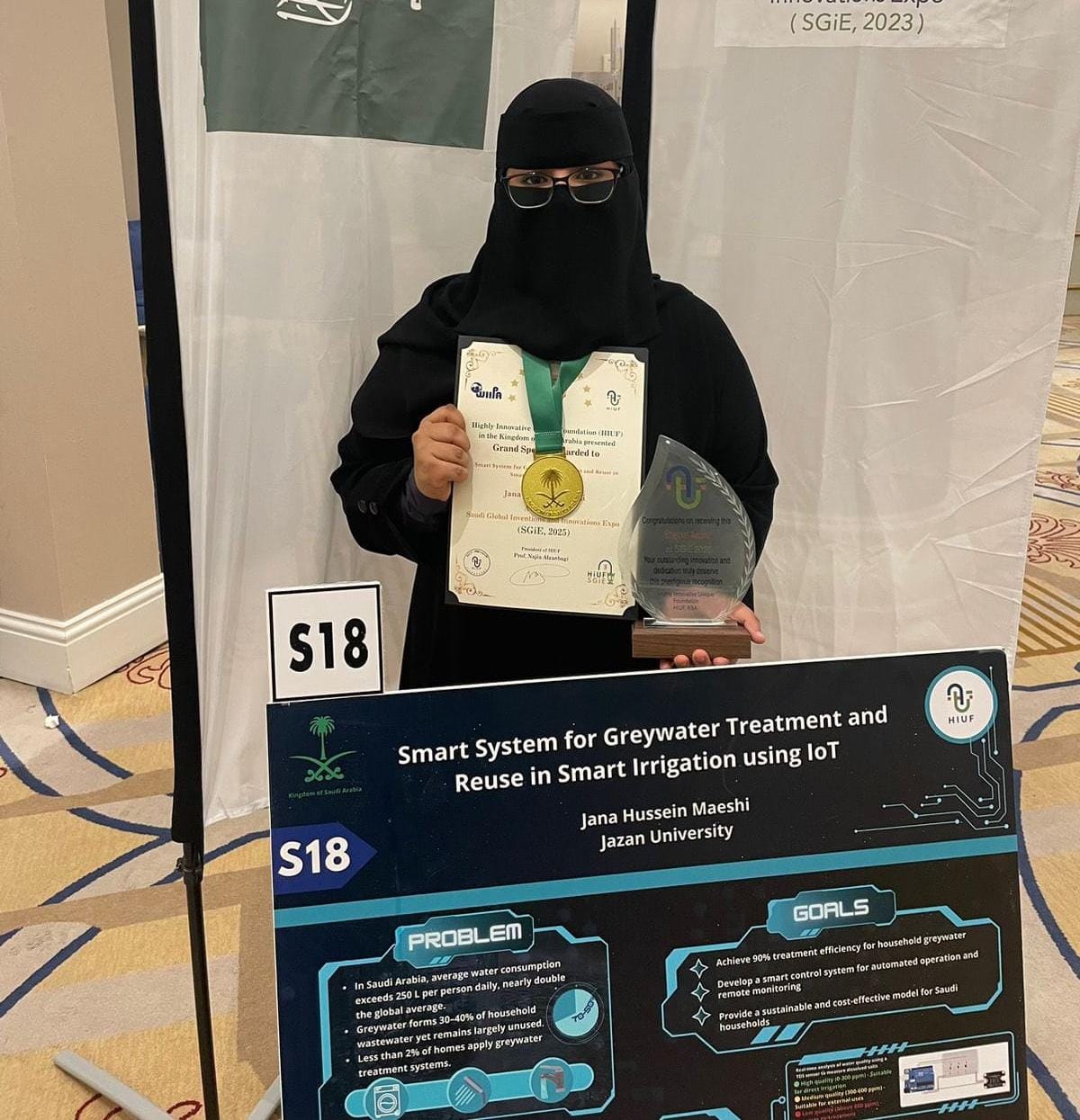 في زمنٍ تتسارع فيه خطى الابتكار وتتنامى فيه الحاجة إلى حلول تحمي الموارد وتدعم الاستدامة، يبرز اسم شابة سعودية استطاعت أن تحجز لنفسها مساحة مضيئة بين نجوم الإبداع العالمي، إنها الطالبة جنا بنت حسين معشي، من قسم الهندسة الكيميائية بكلية الهندسة وعلوم الحاسب في جامعة جازان، التي نجحت في أن تتوَّج بالميدالية الذهبية والجائزة الخاصة الكبرى من HIUF خلال مشاركتها في المعرض السعودي العالمي للاختراعات والابتكارات SGiE 2025، عن ابتكارٍ نوعي يحمل رؤية واضحة ورسالة بيئية عميقة، ونظام ذكي لمعالجة المياه الرمادية وإعادة استخدامها في الري بتقنيات إنترنت الأشياء.هذا الإنجاز لم يكن مجرد تتويج أكاديمي، بل محطة فارقة في مسيرة طالبة تؤمن بأن الهندسة ليست معادلات جامدة، بل نافذة نحو حلول تغيّر حياة الإنسان وتخدم البيئة وتواكب رؤية المملكة الطموحة للمستقبل. فالمشروع الذي ابتكرته جنى لا يقدّم مجرد تقنية مبتكرة، بل يقدم نموذجًا عمليًا يستجيب لتحديات إدارة المياه، خصوصًا في المناطق الزراعية التي تعتمد على كميات كبيرة من المياه، ويجعل من المياه الرمادية موردًا قابلًا لإعادة التدوير بطريقة ذكية ومُجدية.