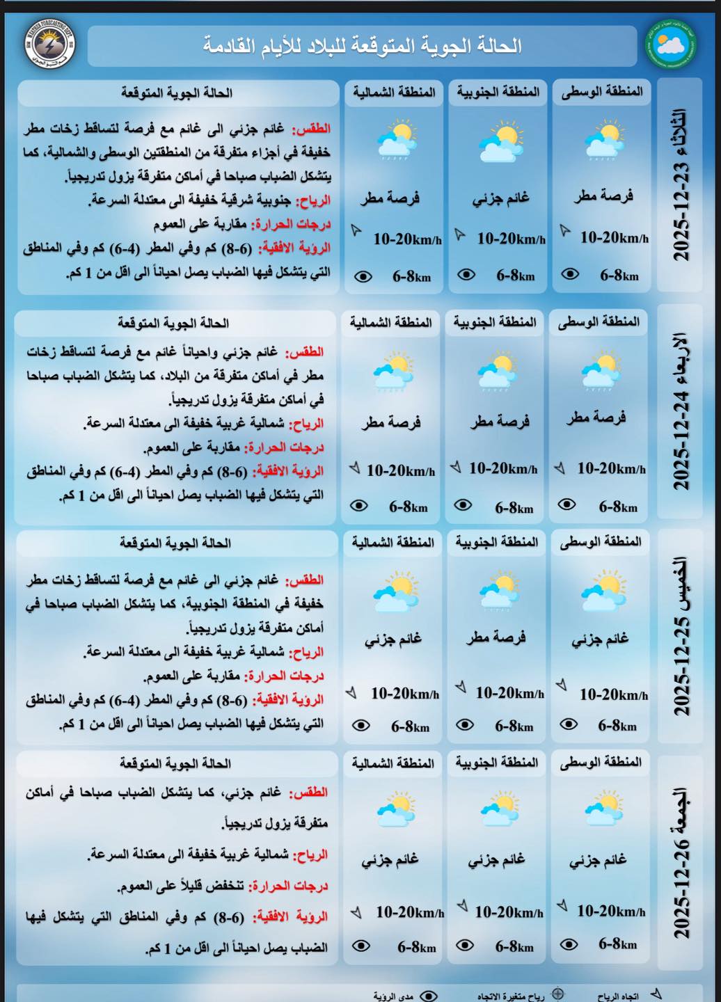 وتابع إن (طقس يوم غد الأربعاء سيكون غائماً جزئياً وأحياناً غائماً، مع فرصة لتساقط زخات مطر في أماكن متفرقة من البلاد، كما يتشكل الضباب صباحاً ويزول تدريجياً، ولا تغير بدرجات الحرارة).