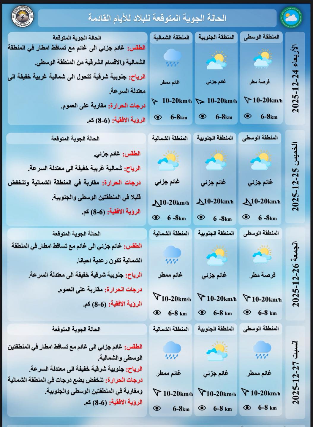 توقعت الهيئة العامة للأنواء الجوية والرصد الزلزالي التابعة لوزارة النقل، إن يكون طقس اليوم الأربعاء ممطراً. وقال بيان تلقته (الزمان) أمس إن (طقس اليوم الأربعاء سيكون غائماً جزئياً إلى غائم مع تساقط زخات أمطار في المنطقة الشمالية والأقسام الشرقية من المنطقة الوسطى)، وأضاف إن (درجات الحرارة العظمى تسجل في السليمانية 14 ودهوك ونينوى وصلاح الدين 16 والأنبار وأربيل وكركوك 15 وديالى 17 وبغداد وكربلاء 18 وبابل والمثنى وميسان 19 والديوانية وواسط والنجف 20 وذي قار والبصرة 21 درجة مئوية)، وتابع البيان إن (طقس يوم غد الخميس سيكون غائماً جزئياً في عموم البلاد، ودرجات الحرارة مقاربة في المنطقة الشمالية ، وتنخفض قليلاً في المنطقتين الوسطى والجنوبية). ورجح متنبئ جوي، في وقت سابق، تقدّم موجات من الغيوم عبر الأجواء الغربية للبلاد، إيذاناً بتأثر مناطق متفرقة بحالات جوية متتابعة، تتضح ذروتها في المنطقتين الشمالية والوسطى. وكتب صادق عطية على صفحته في فيسبوك أمس إن (الخرائط تشير إلى مسار غربي فعّال يحمل تغيرات ملحوظة في الأجواء خلال الساعات المقبلة)، وأضاف إن (فرص هطول زخات مطر خفيفة إلى معتدلة ستكون واردة في مناطق من الشمال والوسط، على أن تتوسع رقعة الهطول ليلاً لتشمل أجزاء من المنطقة الجنوبية)، وتوقّع عطية (تشكّل ضباب كثيف غرب البلاد، ما يؤدي إلى انخفاض كبير في مدى الرؤية الأفقية، بينما يحتمل ظهور ضباب خفيف متفاوت الشدة في بقية المناطق).
