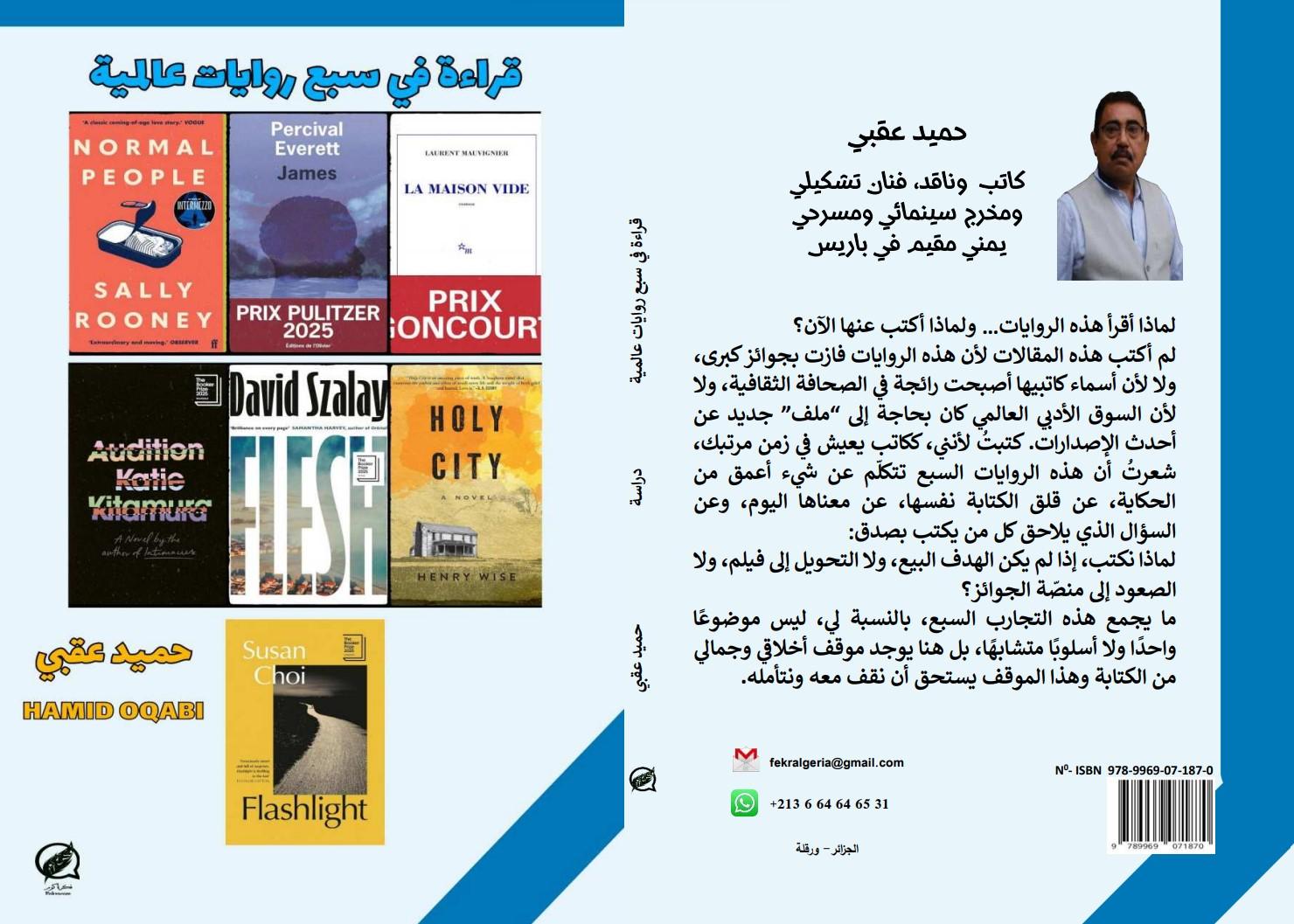 صدر عن دار فكرة كوم للنشر بورفلة ـ الجزائر كتاب «قراءة في سبع روايات عالمية» للكاتب والناقد حميد عقبي والكتابيقدّم قراءة نقدية متأنية لسبع روايات معاصرة تنتمي إلى سياقات ثقافية ولغوية مختلفة وتتقاطع في انشغالها العميق بالإنسان، وهشاشته، والأسئلة الأخلاقية والجمالية التي تطرحها الكتابة اليوم.لم ينطلق الكتاب من منطق الجوائز أو الرواج الإعلامي، بل من موقف نقدي يرى في الرواية فعل وعي ومقاومة هادئة، ومساحة لفهم العالم رغم تعقيداته وهي لا تزيين القبيح أو تسلع الأدب.