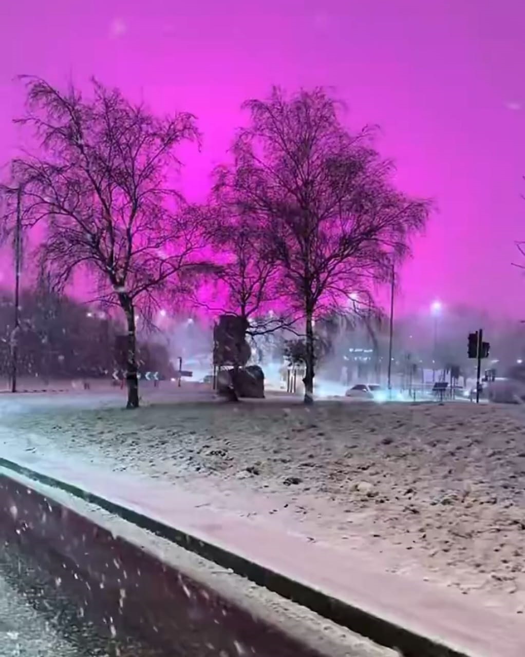 كذلك تلعب الثلوج دوراً مضاعفًا في هذا التأثير البصري إذ تتمتع بقدرة عالية على عكس الضوء ما يزيد من شدة الألوان المنعكسة ويجعل السماء تبدو وكأنها متوهجة بدرجات أرجوانية أو وردية قوية خاصة خلال ساعات الليل ويضاف إلى ذلك أن امتزاج الضوء الأزرق والبنفسجي الصادر عن بعض مصابيح (LED) مع ألوان أخرى مثل الأحمر أو البرتقالي يؤدي إلى هذا الطيف اللوني.وبصورة عامة فإن اللون البنفسجي لا ينتج عن مصباح ملون أو إنارة خاصة بل هو نتيجة طبيعية لاستخدام مصابيح الشوارع LED البيضاء التي تبعث الضوء الأزرق والمغطاة بطبقة فسفورية لتحويله إلى ضوء أبيض ومع وجود الغيوم المنخفضة وتساقط الثلوج ينعكس جزء من الطيف الأزرق بقوة نحو الأسفل ويمتزج مع أطياف ضوئية أخرى،ك ما يمنح السماء ذلك اللون الوردي أو البنفسجي ويعد هذا التأثير البصري معروفاً علمياً في دراسات التلوث الضوئي ولا يرتبط بأي خلل تقني أو ظاهرة غير طبيعية.كما أن هذا المشهد لا يمت بصلة إلى الشفق القطبي الذي يتطلب نشاطاً شمسياً مرتفعاً وظروفاً مغناطيسية خاصة ولا يعد مؤشراً على أي خلل بيئي أو تغير مفاجئ في طبيعة الغلاف الجوي.مضيفا(أن مثل هذه المشاهد ترصد بشكل متكرر في مدن عديدة حول العالم لا سيما خلال فصل الشتاء عندما تتزامن الثلوج أو الضباب مع الغيوم المنخفضة وإضاءة المدن الكثيفة فتتحول السماء إلى لوحة لونية وتُعد مثالًا على تأثير التلوث الضوئي في المدن الحديثة بعيداً عن أي تفسيرات غير علمية).