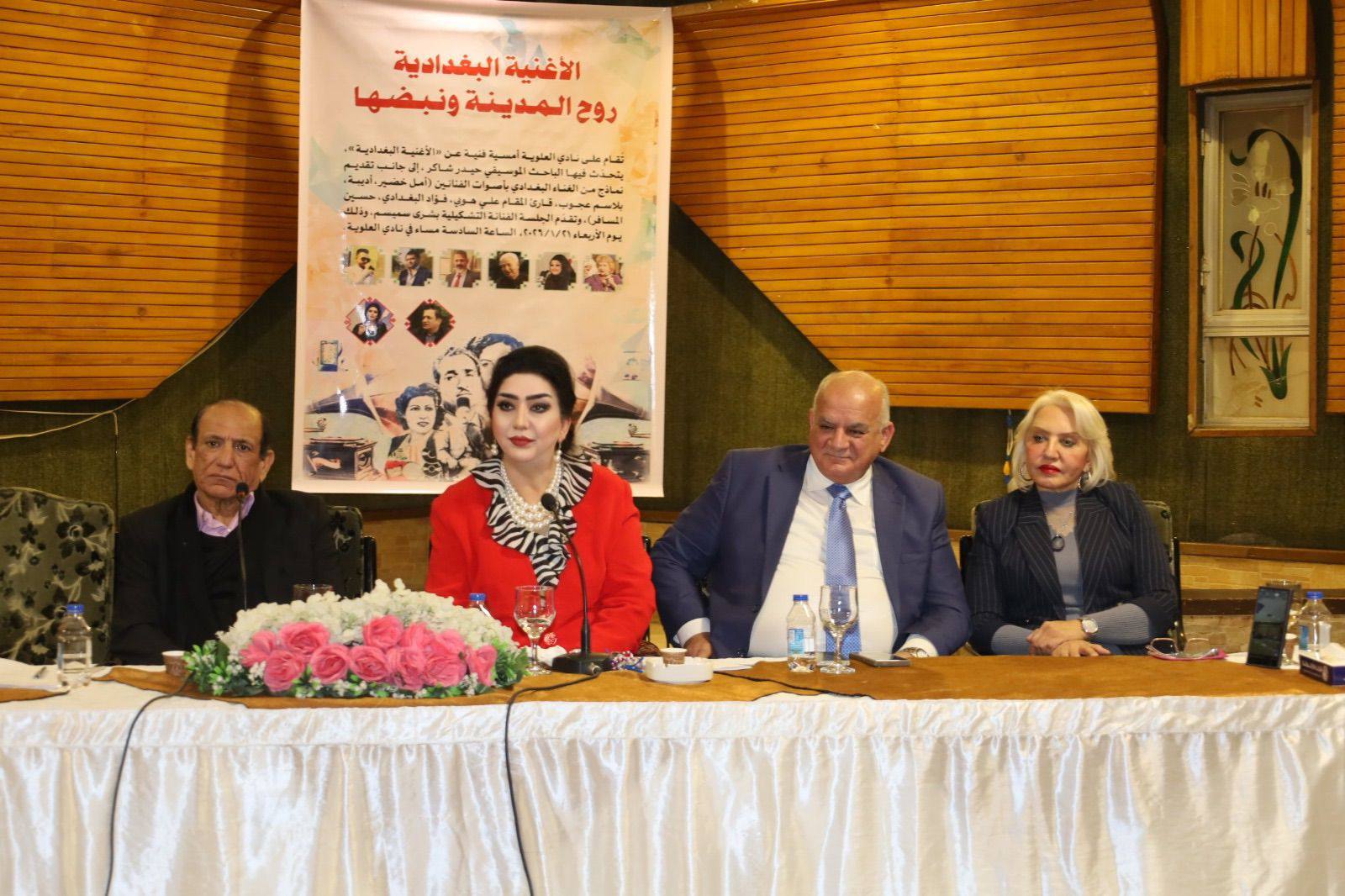 ضيفت قاعة نادي العلوية الاربعاء الماضي امسية عن (الاغنية البغدادية روح الحياة ونبضها) مع ضيف الجلسة الباحث الموسيقي حيدر شاكرالى جانب تقديم تقديم نماذج من الغناء البغدادي الاصيل بأصوات مطربين لهم مسيرة طويلة في الغناء البغدادي. وحضر الأمسية جمهور غفير من محبي التراث الجميل وعدد من الإعلاميين وأصحاب الفكر الثقافي والأدبي والموسيقى. وشارك في الغناء في الامسية المطربتين أمل خضيرو اديبة والفنان الرائد بلاسم عجوب روقارىء المقام الشاب علي هوبي وقارىء المربعات فؤاد البغدادي وسعد العطار وحسين المسافر وقدمت الجلسة الاعلامية بشرى سميسم قائلة (لنبدأ بتعريف الأغنية البغدادية فهي لون غنائي نشأ في مدينة بغداد ويُغنّى بلهجتها، ويتميّز بالبساطة الظاهرية والعمق العاطفي، ويرتبط بالحياة اليومية للناس، أفراحهم، أحزانهم، وعلاقاتهم الاجتماعية اما النشأة والتطور التاريخي فتعود جذور الأغنية البغدادية إلى أواخر القرن التاسع عشر وبدايات القرن العشرين.وتطورت من: المقام العراقي (وهو فن غنائي كلاسيكي معقّد)، الأهازيج الشعبية، الأغاني الريفية التي انتقلت إلى بغداد مع الهجرة) مضيفة (الاغنية البغدادية ازدهرت بشكل كبير بعد تأسيس الإذاعة العراقية عام 1936 وانتشار الأسطوانات والحفلات الشعبية اما ابرز الخصائص الفنية لها فهي انها تُغنّى باللهجة البغدادية الخالصة وتحتوي على مفردات دارجة مثل: حبيبي، يابه، يمّه، دلّعني، آنا اما اللحن فهو بسيط وسلس ويعتمد على الشجن والانتقال الناعم بين الجُمل الموسيقية وسهل الحفظ والترديد وغالبا الإيقاع يكون غالباً بطيئاً أو متوسط اما أشهر الإيقاعات فهي:الجورجينا والسماح والوحدة) وعن المقامات الموسيقية المستخدمة اوضحت ان (الأغنية البغدادية تستند إلى المقامات العراقية ولكن بشكل مبسّط، وأهمها: البيّات (الأكثر شيوعاً– دافئ وحزين)، الرست،الحجاز، السيكاه والنهاوند. اما الآلات الموسيقية فكانت في بداياتها: العود، الجوزة، القانون، السنطور، الطبلة والرق ،لاحقاً أُدخلت الالات التالية :الكمان،الأكورديون والآلات الغربية الخفيفة.و الموضوعات التي تتناولها هي الحب العفيف والشوق والفراق والعتاب والغزل البغدادي اللطيف والحنين لبغداد والأماكن الشعبية وكذلك الحياة الاجتماعية (المقهى، الزقاق، الجيران). وعن البناء الشعري قالت (انها ذات كلمات بسيطة لكنها عميقة تعتمد على: التكرار، القافية الواضحة، الجُمل القصيرة وكثيراً ما تكون على شكل مربّعات أو مقاطع قصيرة. اما أشهر روّاد الأغنية البغدادية منن المطربين هم: ناظم الغزالي (الأيقونة الأهم)، يوسف عمر، داخل حسن (تأثر بها رغم ريفيته)، سعدي الحلي، فؤاد سالم ومائدة نزهت ومن الشعراء: عبد الكريم العلاف، جبوري النجار، زامل سعيد فتاح ومظفر النواب (في بعض الأعمال الشعبية). ومن الملحنين: رضا علي، محسن فرحان وطالب القره غولي اما مكانتها اليوم فهي تُعد تراثاً موسيقياً عراقياً أصيلاً وتُدرّس في المعاهد الموسيقية، ولا تزال حاضرة في: الأعراس والمقاهي التراثية والمهرجانات الثقافي).