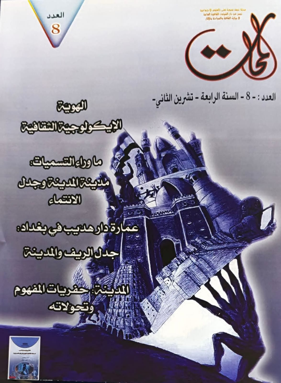 عن دار الشؤون الثقافية العامة وزارة الثقافة والسياحة والآثار صدر العدد :- - 8 - السنة الرابعة من مجلة " لمحات " المجلة نصف سنوية ، تعنى بالعلوم الإجتماعية، وتهدف إلى تكريس الفكر الاجتماعي العلمي الرصين ، وتستقطب الباحثين البارزين ، لتفعيل الكتابة والبحث في مجال العلوم الاجتماعية في العراق، فضلاً عن فسح المجال أمام الباحثين للإطلاع على آخر مستجدات البحث الاجتماعي ، وطرح الموضوعات العميقة ، وتوظيف مقاربات متعددة الاختصاصات لاستيعاب تلك الموضوعات . وجاء في هذا العدد الإفتتاحية / كلمة رئيس التحرير د. علاء حميد دريس ومنها "" منذ نشوء الدولة الحديثة في العراق تعزز التصور القائل أن من يحكم مدينة بغداد يحكم العراق ، في حين لم ينطبق هذا التصور على إقليم كردستان العراق ؛ ويعود ذلك إلى أن الدولة العراقية عند قيامها ، لازمته، تداعيات المسألة الكردية و صراعاتها مع نظام الحكم الذي إقامته بريطانيا ، فالصراع بين النظام السياسي وإقليم كردستان ، في عمقه ، قائم على الجغرافية والسكان ، وهذان العاملان هما من يصنع المدينة. ويرتبط تاريخ المدن في العراق بعوامل السياسة والاقتصاد ، والقرب والبعد عن بغداد ، إذ كان لهذه العوامل دور حيوي في صياغة شكل المدينة ، ومثال على ذلك مدينة البصرة، التي تستقر على كونها مدينة ذات طابع اقتصادي فحسب ، بل تعدت ذلك إلى اداء وظيفة الثكنة العسكرية لتكون بوابة لمجمل التحولات التي شهدها العراق منذ دخول بريطانيا عام ١٩١٤ وحتى مجئ الأمريكيين عام ٢٠٠٣ . "" وفي باب دراسات جاء دراسة ما وراء التسميات : مدينة المدينة وجدل الانتماء للباحث نعمة العبادي / والجغرافيا العراقية و مفارقات الديالكتيك الحضاري لثامر عباس / وعمارة دار هديب في بغداد : جدل الريف والمدينة للباحث بلال سمير علي / المدن العراقية إنهيار الفضاء المدني وصعود البنية القروية : للباحث أحمد حسن /الهوية الإيكولوجية الثقافية للدكتور منتصر صباح الحسناوي / تفكيك الفضاء السياسي الحضري في العراق : أبي الخير حافظ الدليمي / وضم باب دراسات العديد من الدراسات والبحوث الأخرى / وفي باب مفهوم : المدينة : حفريات المفهوم وتحولاته ل أحمد قاسم مفتن / وفي باب عالم في المجلة نقرأ : الانثربولوجست ريموند فيرث والممائلة على وجه النقيض لدراسة المدينة : حسين فاضل سلمان / وفي باب كتاب : سوسيولوجيا الحياة اليومية : دراسة ميدانية في سوق بغداد الجديدة / واثق صادق رسن بقلم مها أسعد حمزة / وفي دراسات متنوعة : مناهج الإثنولوجيا : في أساليب دراسة الثقافات والحضارات البشرية / فرانز بواس / ترجمة يحيى حسين زامل / الخطاب العلماني وإشكالية ترسيخه في المجتمع التقليدي : محمود شمال حسن / أهمية التخوم في التاريخ الأمريكي ١٨٩٣ " - مقتطفات / ترجمة عذراء ناصر . . .