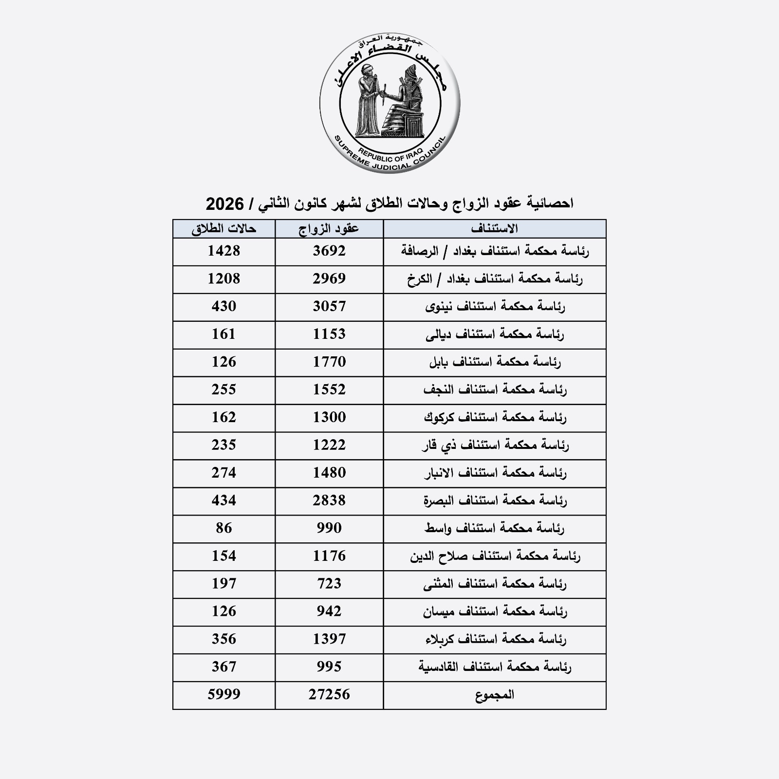 ويشهد العراق منذ سنوات تصاعداً تدريجياً في نسب الطلاق، وسط تحذيرات متكررة من المؤسسات الدينية والقانونية بضرورة إيجاد معالجات جذرية للحد من ظاهرة التفكك الأسري التي باتت تهدد البنية الاجتماعية للبلاد.