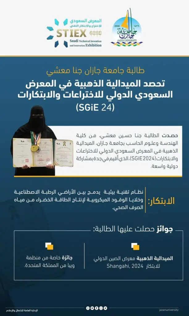 في زمنٍ تتسارع فيه خطى الابتكار وتتنامى فيه الحاجة إلى حلول تحمي الموارد وتدعم الاستدامة، يبرز اسم شابة سعودية استطاعت أن تحجز لنفسها مساحة مضيئة بين نجوم الإبداع العالمي، إنها الطالبة جنا بنت حسين معشي، من قسم الهندسة الكيميائية بكلية الهندسة وعلوم الحاسب في جامعة جازان، التي نجحت في أن تتوَّج بالميدالية الذهبية والجائزة الخاصة الكبرى من HIUF خلال مشاركتها في المعرض السعودي العالمي للاختراعات والابتكارات SGiE 2025، عن ابتكارٍ نوعي يحمل رؤية واضحة ورسالة بيئية عميقة، ونظام ذكي لمعالجة المياه الرمادية وإعادة استخدامها في الري بتقنيات إنترنت الأشياء.