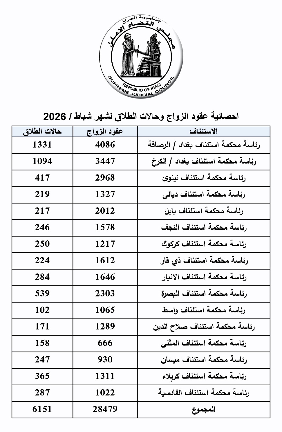 وذكر بيان للمجلس تلقته (الزمان) امس ان (مجموع عقود الزواج المسجلة في جميع المحافظات، بلغ 28479 عقداً خلال الشهر الماضي، باستثناء إقليم كردستان٬ فيما وصل عدد حالات الطلاق إلى 6151 حالة خلال المدة نفسها)٬