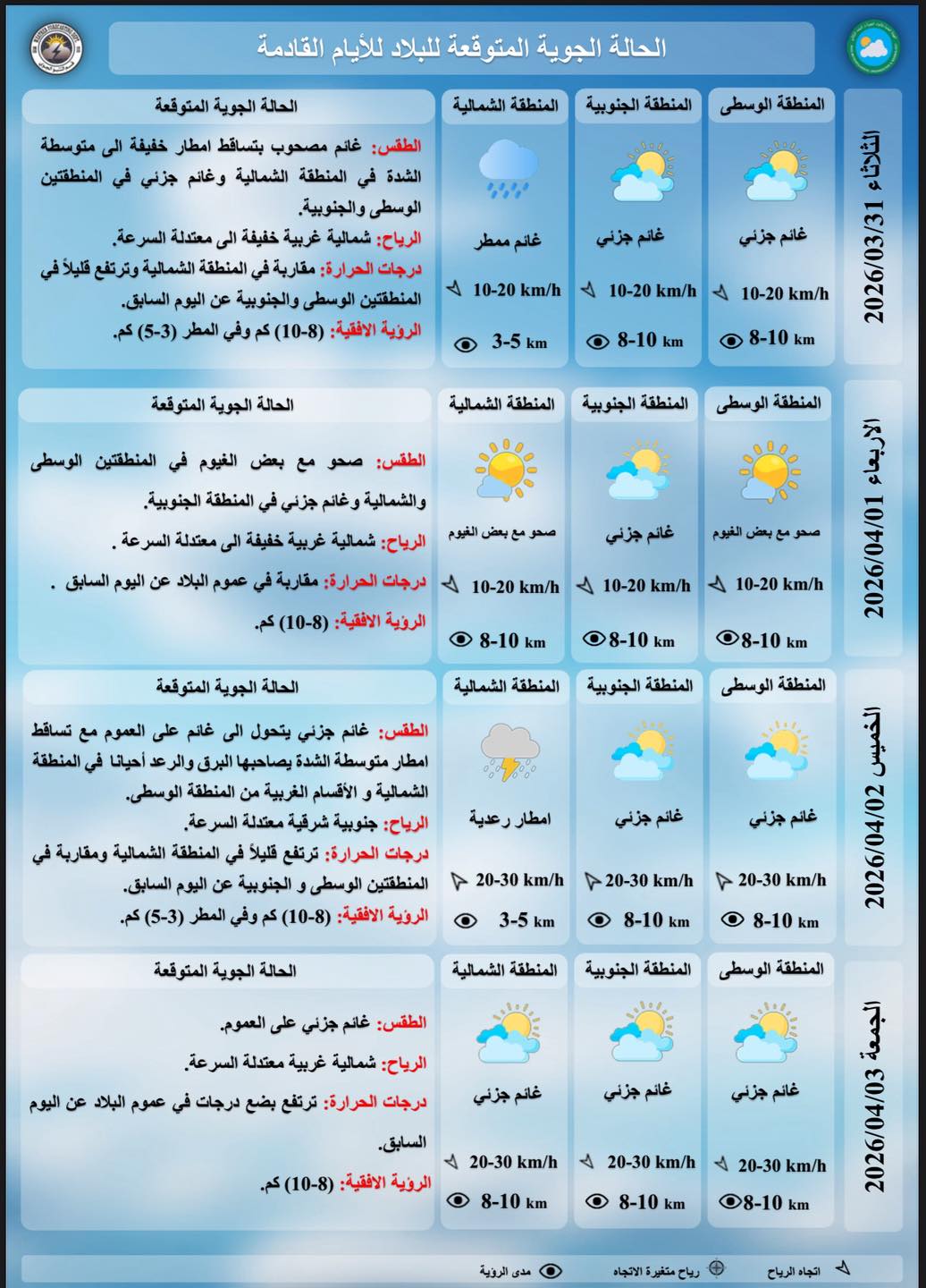 رجحت الهيئة العامة للأنواء الجوية والرصد الزلزالي التابعة لوزارة النقل، إن يكون طقس اليوم الثلاثاء غائماً مصحوباً بامطار شمالاً. وقالت الهيئة في بيان تلقته (الزمان) أمس إن (طقس اليوم الثلاثاء سيكون غائماً مصحوباً بتساقط أمطار خفيفة إلى متوسطة الشدة شمالاً، وغائماً جزئياً في المنطقتين الوسطى والجنوبية).