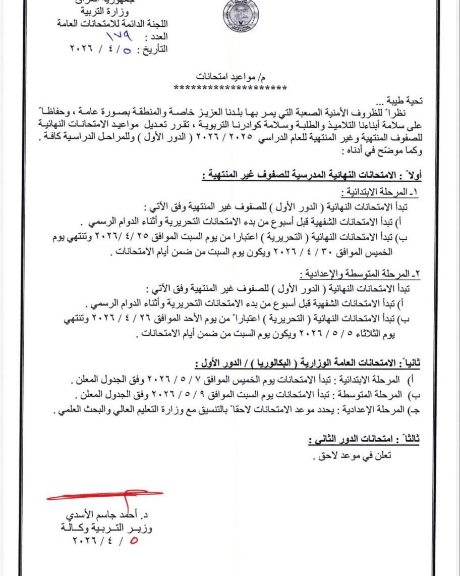 داعياً (المديريات العامة والمدارس، إلى تبليغ التلاميذ والطلبة بدقة بشأن المواعيد الجديدة لضمان الاستعداد الكامل للامتحانات).