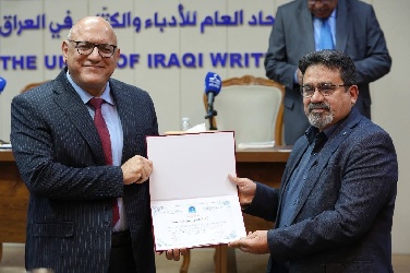 واشار المحاضر (لدينا اربع كليات حكومية نحن في كلية الإعلام جامعة بغداد لدينا إذاعة وتلفزيون وبث مباشر الكليات الأهلية سبورة وصف كيف يكون هناك اعلامي ناجح جامعة بابل قبلت ستة طلاب،مقابل كلية أهلية قبلت أكثر من مئة طالب). وشهدت الجلسة شهادات ومداخلات بحق المحتفي به.من زملائه وأصدقائه، ناقشت الموضوع بمهنية ودعت إلى ضرورة إيجاد الحلول المناسبة رغم كل التحديات. وفي نهاية الجلسة تم تقديم شهادة تقديرية من اتحاد الادباء الى المحاضر الدكتور عمار قدمها الناقد علي حسن الفواز وقلادة الملتقى قدمها الصحن مع اخذ الصورة التذكارية بهذه المناسبة. الى ذلك زار المتحدثُ الرسمي باسم نقابة الصحفيين العراقيين رعد المشهداني، كليةَ الإعلام في جامعة بغداد، والتقى بعميدها عمار طاهر ، لبحث سبل التعاون المشترك وتعزيز الشراكة بين الجانبين، بما يخدم تطوير العمل الإعلامي الأكاديمي والمهني.وخلال اللقاء، أكد المشهداني (استعداد النقابة لرعاية مهرجان قسم الإذاعة والتلفزيون، مشيدًا بالدور الأكاديمي الذي تضطلع به الكلية في إعداد كوادر إعلامية مهنية). مؤكدًا (انفتاح النقابة على توسيع مجالات التعاون مع الكلية).من جانبه، رحّب عميد الكلية بهذه الزيارة، مثمنًا (أهمية تعزيز التعاون مع نقابة الصحفيين، بما يسهم في تطوير مهارات الطلبة وتعزيز الجانب التطبيقي في العملية التعليمية).