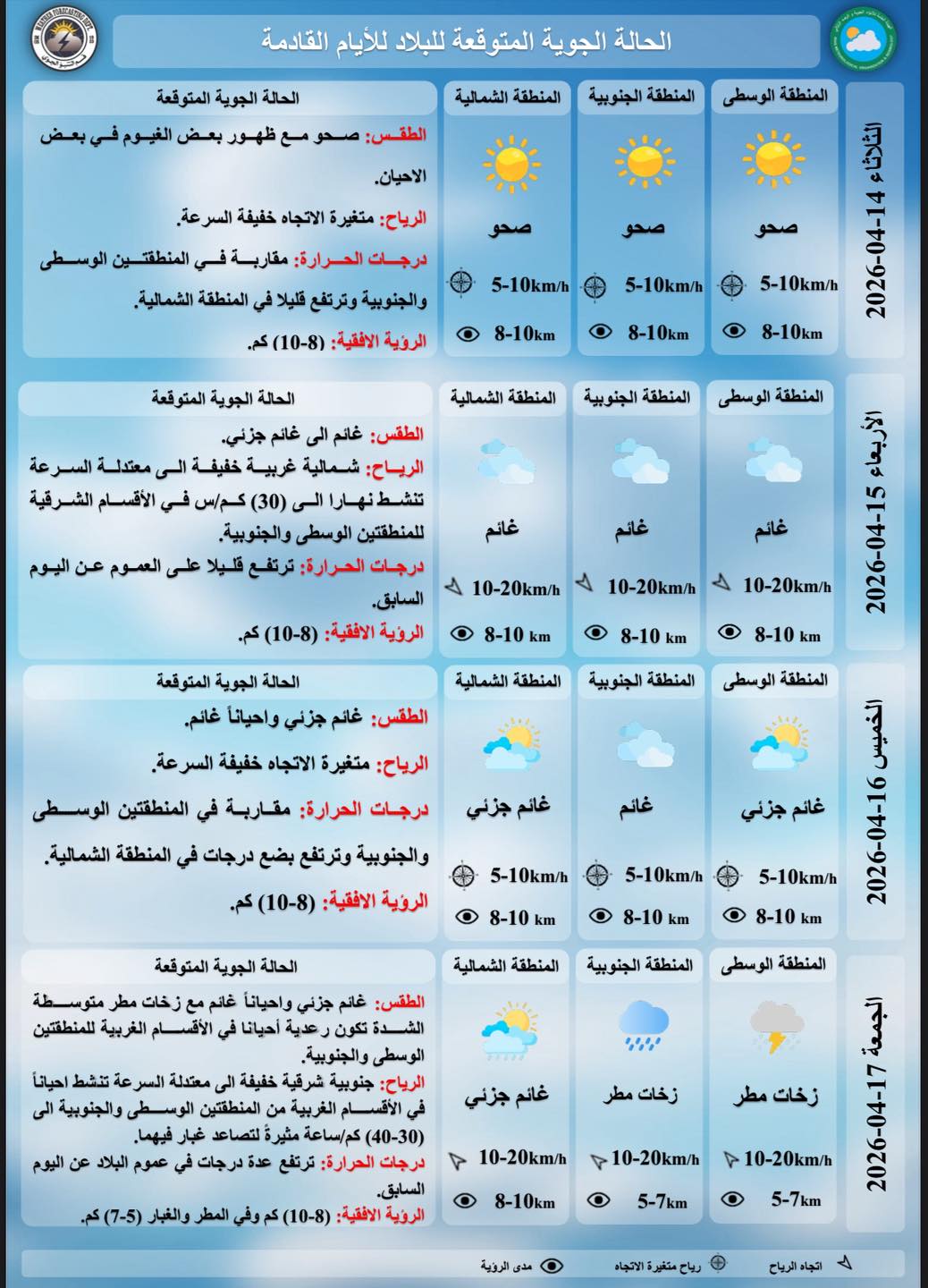 رجحت الهيئة العامة للأنواء الجوية والرصد الزلزالي التابعة لوزارة النقل، إن يكون طقس اليوم الثلاثاء تساقط أمطار وتصاعداً للغبار مع ارتفاع في درجات الحرارة. وقال بيان تلقته (الزمان) أمس إن (طقس اليوم الثلاثاء سيكون صحواً مع ظهور بعض الغيوم في أوقات متفرقة). وأضاف إن (درجات الحرارة ستسجل في نينوى 17 والسليمانية 19 ودهوك وأربيل 20 وميسان 23 والأنبار وكركوك 24 وبغداد 25 وواسط وديالى وكربلاء وذي قار 26 وصلاح الدين 27 والنجف وبابل والديوانية والمثنى 28 والبصرة 29 درجة مئوية). وفي دهوك، اعادت دائرة صيانة الطرق والجسور، فتح الطريق الرابط بين ناحية كاني ماصي ومعبر سرزير الحدودي مع تركيا، بعد إغلاقه نتيجة عاصفة ثلجية. وقال مسؤول إعلام الدائرة كمال محمد في تصريح أمس إن (فرق إزالة الثلوج باشرت برفع التراكمات التي خلفتها العاصفة الثلجية، التي أدت إلى قطع الطريق). وتابع إن (سماكة الثلوج بلغت نحو 15 سنتيمتراً على امتداد الطريق البالغ طوله نحو 12 كيلومتراً). مؤكداً (إعادة فتحه أمام حركة السير). وكانت 14 طالبة قد أُصيبت، جراء انقلاب حافلة تقلهن في قضاء العمادية شمالي دهوك. وقال مصدر أمس إن (الحادث وقع في قرية تابعة لناحية ديرلوك، أثناء توجه الحافلة من العمادية إلى جامعة زاخو). عازياً (السبب إلى سوء الأحوال الجوية وهطول أمطار غزيرة وتساقط الثلوج، ما أدى إلى انزلاق الطريق وانقلاب الحافلة). ومضى المصدر إلى القول إن (جميع الإصابات طفيفة وتراوحت بين رضوض وكسور من دون تسجيل حالات خطرة). ولفت إلى (نقل المصابات إلى مستشفى آزادي التعليمي لتلقي العلاج ومن ثم إعادتهن إلى منازلهن).