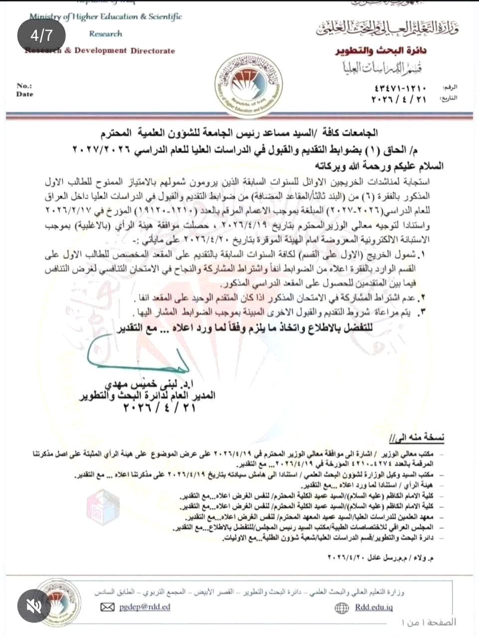 وافقت قرار وزارة التعليم العالي والبحث العلمي، على شمول الخريجين الأوائل من السنوات السابقة بالتقديم إلى الدراسات العليا ضمن المقاعد المخصصة للطالب الأول على القسم، بما ينسجم مع شروط القبول المعتمدة للعام الدراسي المقبل. وجاء في وثيقة مذيلة بتوقيع مدير عام دائرة البحث والتطوير لبنى خميس مهدي جاء فيها إنه (استجابة لمناشدات الخريجين الأوائل للسنوات السابقة، الذين يرومون شمولهم بالامتياز الممنوح للطالب الأول المذكور بالفقرة سادساً من البند ثالثاً ضمن المقاعد المضافة من ضوابط التقديم والقبول في الدراسات العليا داخل العراق للعام الدراسي المقبل، حصلت موافقة هيئة الرأي على شمول  شمول الخريج الأول على القسم لكافة السنوات السابقة بالتقديم على المقعد). واشترطت الوثيقة (المشاركة والنجاح في الامتحان التنافسي، اما إذا كان المتقدم الوحيد على المقعد، فلا يُشترط المشاركة في الامتحان المذكور). مشددة على (مراعاة شروط التقديم والقبول بموجب الضوابط المشار إليها).